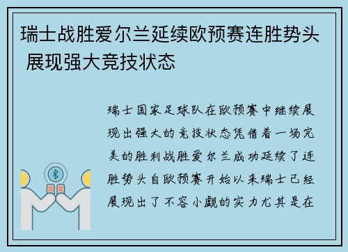 通过对瑞士战胜爱尔兰的详细分析,我们不难发现,瑞士队的连胜势头并非偶然。球队的成功离不开整体战术的精心布置,也离不开球员的出色表现和教练团队的指导。在未来