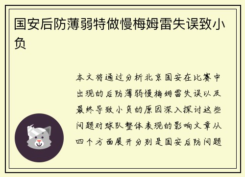本文将通过分析北京国安在比赛中出现的后防薄弱、慢梅姆雷失误以及最终导致小负的原因,深入探讨这些问题对球队整体表现的影响。文章从四个方面展开,分别是“国安后防问题的根源”、“慢梅姆雷的失误分析”、“后防薄弱对战术部署的影响”以及“如何解决国安防守问题”。通过这些角度的剖析,本文不仅揭示了球队当前防守方面的薄弱环节,还提出了改进的方向。最终,文章通过总结分析国安防线存在的问题和应对策略,为球队未来的防守升级提供参考。