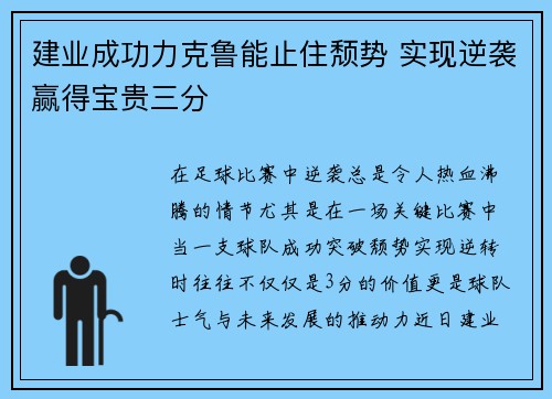 在足球比赛中,逆袭总是令人热血沸腾的情节,尤其是在一场关键比赛中,当一支球队成功突破颓势、实现逆转时,往往不仅仅是3分的价值,更是球队士气与未来发展的推动力。近日,建业队在与鲁能队的比赛中,凭借出色的表现,成功止住了颓势,完成了逆袭,赢得了宝贵的三分。本场比赛,不仅是对建业队球员们精神与意志的巨大考验,也是他们向外界展示自身强大实力的时刻。本文将从战术调整、球员表现、心理因素以及比赛结果四个方面,详细解析建业成功力克鲁能的过程,剖析他们如何通过细致入微的准备与坚定的决心,最终实现了胜利。